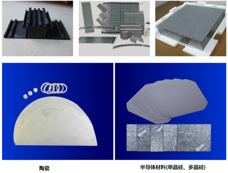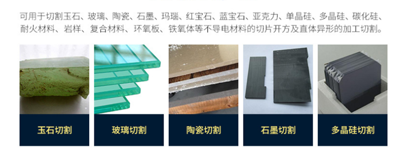 可用于脆硬材料的異形和切片加工,如:藍(lán)寶石、單晶硅、多晶硅、氧化鋁、陶瓷、寶石玉等材料。